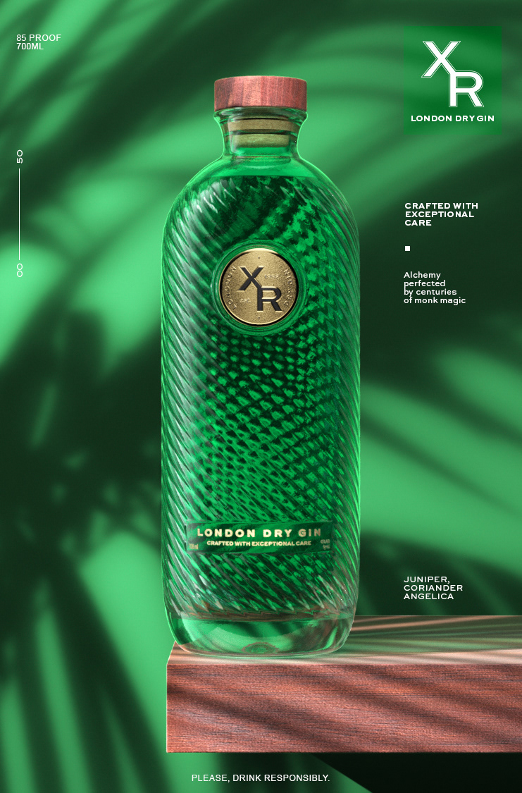 XR Gin is a study with more stylized shots and another unique bottle design. I based the bottle on Gogoon alcohol. My focus was to create some advertising shots that could be used on social or in magazines.